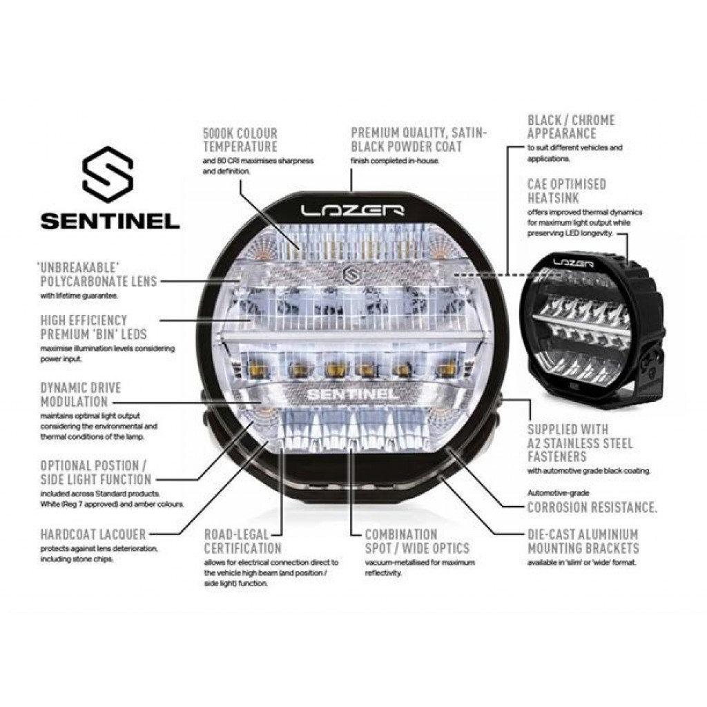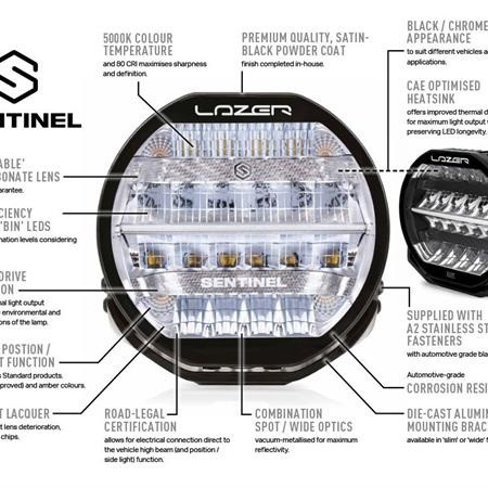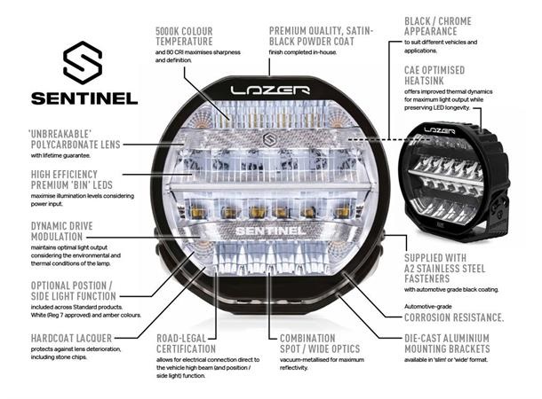 Nytt for 2021, Sentinel-serien er 9tom runde lamper som kombinerer karakteristisk high-end produktdesign, med overlegen lysytelse og byggekvalitet som symboliserer Lazer Lamps-navnet. Tilgjengelig i standard- eller elitekvaliteter, har førstnevnte 20 høyeffekts-LED-er og leveres med enten svart eller krom-finish inne i lampen.Til sammenligning er Elite-produktet kun tilgjengelig med det svarte innvendige