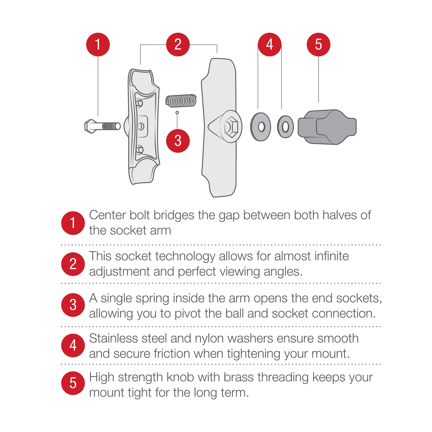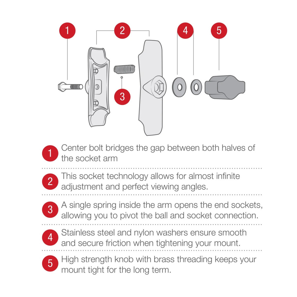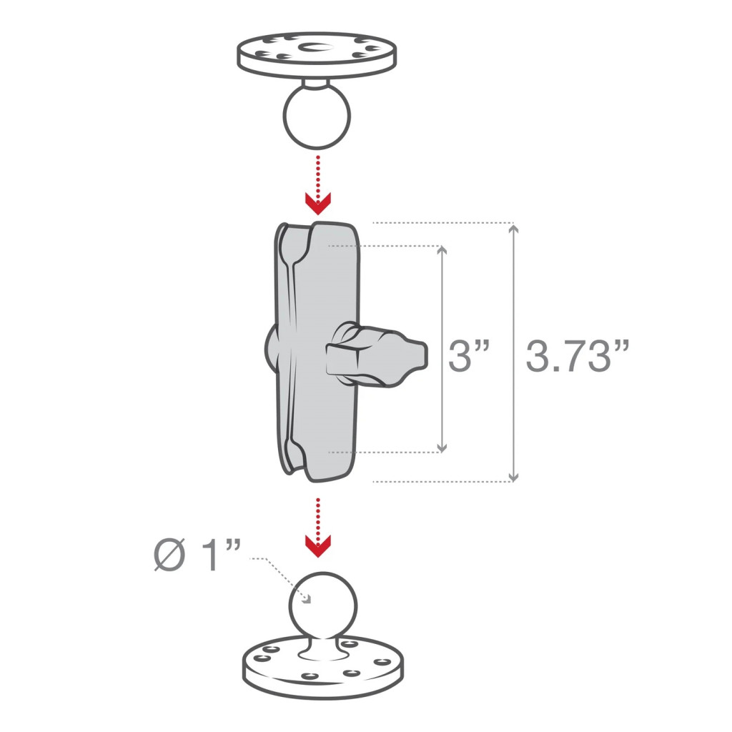 RAM-201U er en middels lang arm som passer til 1,5tom C størrelse ball. En fjær på innsiden holder armen åpen og lar deg sette ballen inn i stikkontakten. Denne armen har en total lengde på 5,69tom. Justeringsknappen gjør det enkelt å justere den tilkoblede enheten.Produkt-dimensjoner:Total lengde: 5,69tom / 14,45 cmMidt-senterarmlengde:4,66tom / 11,84 cmBallstørrelse:C-størrelse (1,5tom) / (3,81 cm)Vektkapasitet:4 lbs / 1,80 kgMateriale:Marine grade aluminium