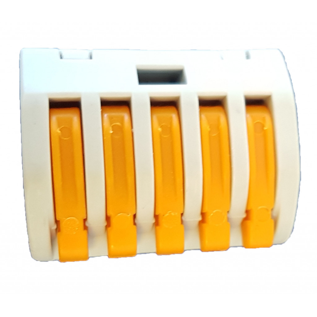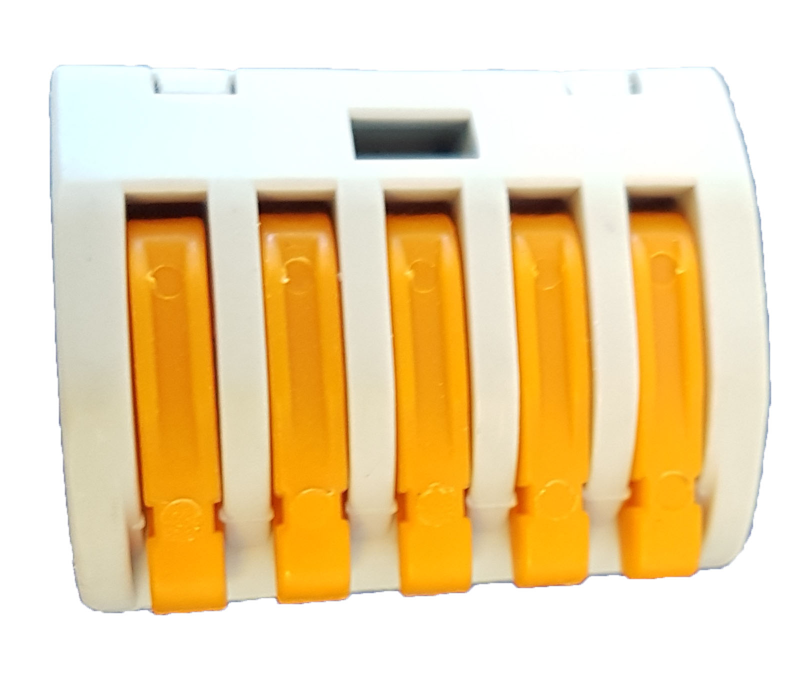 10 stk. WAGO koblingsklemme til 5 ledere, hvor fjæren kan spennes opp før lederen stikkes inn. 222 serien kan benyttes til alle typer ledere. Med denne klemmen kan du enkelt og sikkert koble sammen ledere, uten å skru en eneste skrue. Maks strømstyrke: 32A Maks spenning: 400V Kabeltversnitt: 0,08