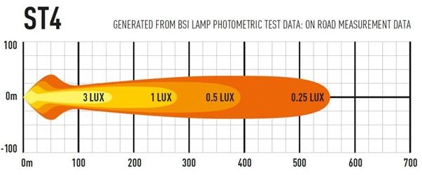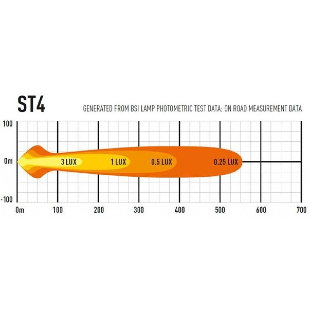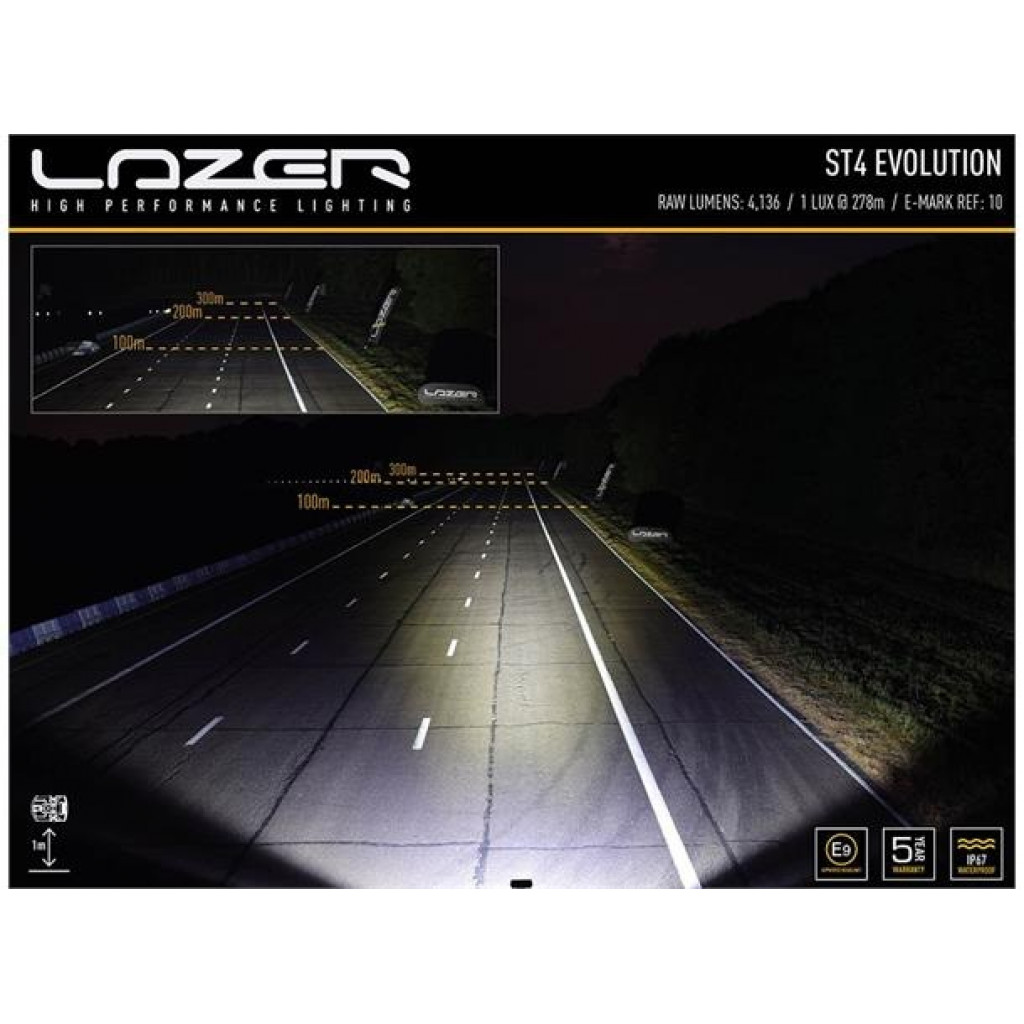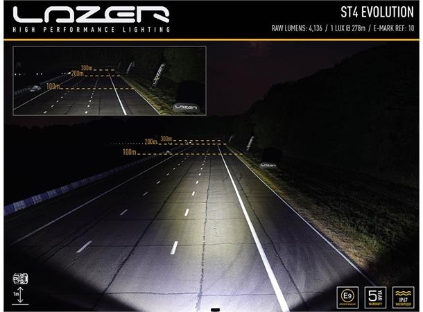 ST / T Evolution-produktserien har svært effektive, førsteklasses 11W LED-er i kombinasjon med vakuummetallisert konisk optikk for å levere et kraftiglysbilde med bred spredning. Dette gjør produktene spesielt godt egnet for bruk på landsbygda og terreng. Med det samme elektriske og produktdesignet på tvers av både ST- og T-lys, indikerer førstnevnte lys som er UNECE-sertifisert i henhold til regel 112 som fjernlyskjørelys, mens sistnevnte indikerer at de større lysfeltene ikke er sertifisert og kun er beregnet for off-road bruk. via en uavhengig bryter.Hva er inkludert:- x1 ST4 Evolution LED Spotlight- x2 Centre Mount (1114k)- x1 Installasjons instrukserKontakttype: AMP Superseal 2-pin.Spesifikasjoner :Voltage Range (DC)10-32VLED Life50,000 hoursWeight670grHIGH BEAM FUNCTIONTotal Luminous Flux4136LmTotal Driver #39FOV#39 Flux†2490LmColour Temperature5000KNumber of High Output LEDs4Power Consumption47WattsCurrent Draw (at 14.4V)3,3AmpsStart-up Time *100msCERTIFICATIONHigh BeamECE R112ECE Reference10DIMENSIONSWidth204mmDepth68 mmHeight64 mmPHOTOMETRIC DATAHorizontal Beam Angle28 deg / 90 deg0.25 lx Line555metres0.5 lx Line393metres1 lx Line278metres3 lx Line160metres