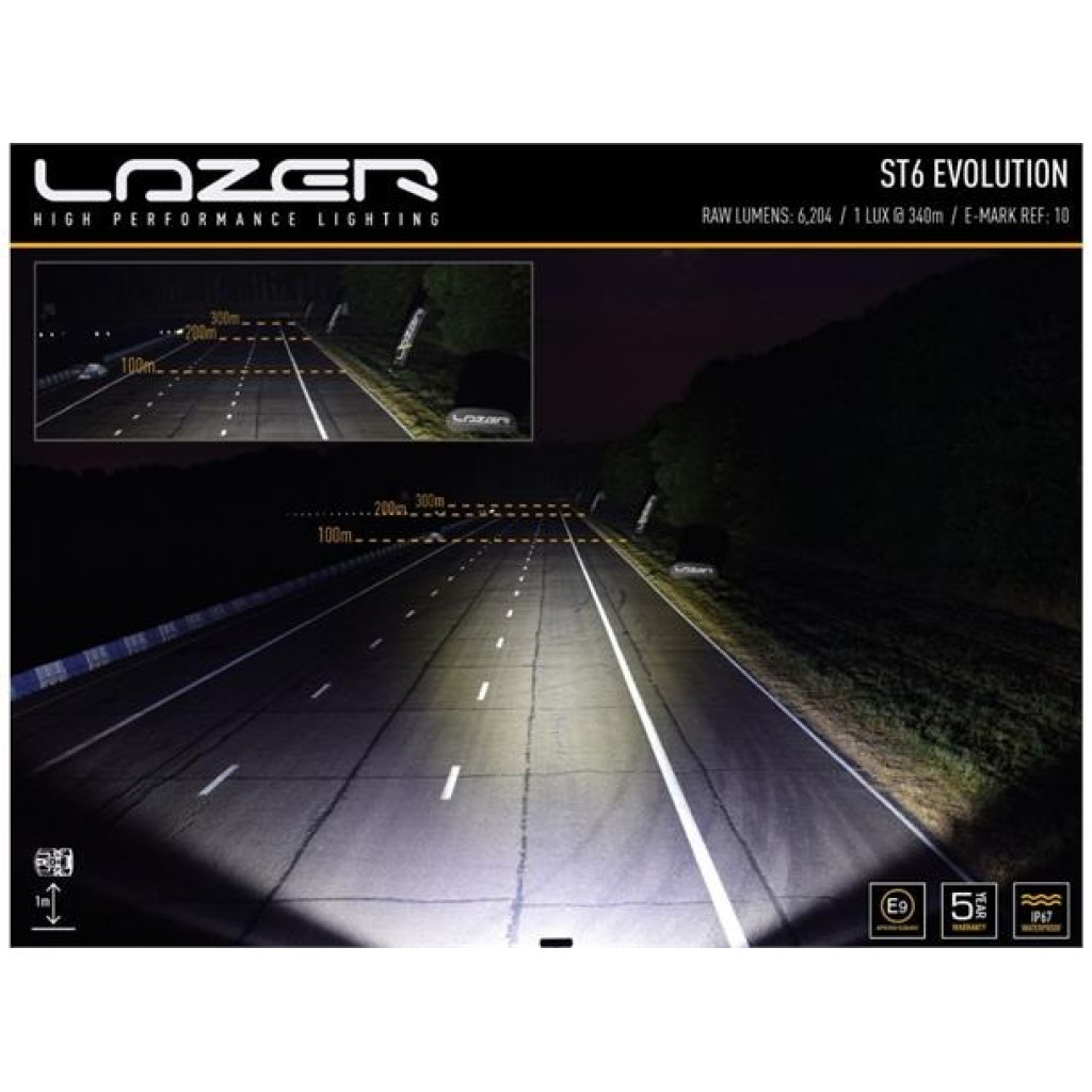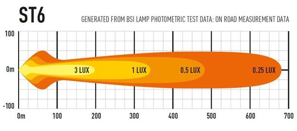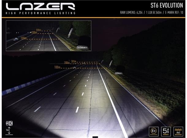 ST / T Evolution-produktserien har svært effektive, førsteklasses 11W LED-er i kombinasjon med vakuummetallisert konisk optikk for å levere et kraftiglysbilde med bred spredning. Dette gjør produktene spesielt godt egnet for bruk på landsbygda og terreng. Med det samme elektriske og produktdesignet på tvers av både ST- og T-lys, indikerer førstnevnte lys som er UNECE-sertifisert i henhold til regel 112 som fjernlyskjørelys, mens sistnevnte indikerer at de større lysfeltene ikke er sertifisert og kun er beregnet for off-road bruk. via en uavhengig bryter.Hva er inkludert:- x1 ST6 Evolution LED Spotlight- x2 Centre Mount (1114k)- x1 Installasjons instrukserKontakttype: AMP Superseal 2-pin.Spesifikasjoner :Voltage Range (DC)10-32VLED Life50,000 hoursWeight912 grHIGH BEAM FUNCTIONTotal Luminous Flux6204 LmTotal Driver #39FOV#39 Flux†3735 LmColour Temperature5000KNumber of High Output LEDs6Power Consumption70 WattsCurrent Draw (at 14.4V)4.9 AmpsStart-up Time *100msCERTIFICATIONHigh BeamECE R112ECE Reference10DIMENSIONSWidth284 mmDepth68 mmHeight64 mmPHOTOMETRIC DATAHorizontal Beam Angle28 deg / 90 deg0.25 lx Line680 metres0.5 lx Line481 metres1 lx Line340 metres3 lx Line196 metres