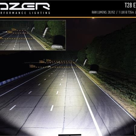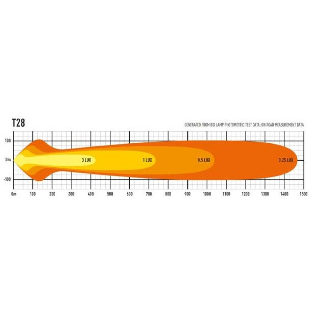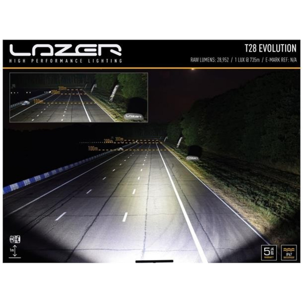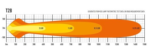 ST / T Evolution-produktserien har svært effektive, førsteklasses 11W LED-er i kombinasjon med vakuummetallisert konisk optikk for å levere et kraftiglysbilde med bred spredning. Dette gjør produktene spesielt godt egnet for bruk på landsbygda og terreng. Med det samme elektriske og produktdesignet på tvers av både ST- og T-lys, indikerer førstnevnte lys som er UNECE-sertifisert i henhold til regel 112 som fjernlyskjørelys, mens sistnevnte indikerer at de større lysfeltene ikke er sertifisert og kun er beregnet for off-road bruk. via en uavhengig bryter.Hva er inkludert:- x1 T28 Evolution LED Spotlight- x3 Centre Mount (1114k)- x1 Side Bracket Kit (1118k)- x1 Single-Lamp Wiring Kit with Switch (1L-HP-300)- x1 Installation InstructionsKontakttype: Deutsch (DT) 2-pin.Spesifikasjoner :Voltage Range (DC)10-32VLED Life50,000 hoursWeight3590grHIGH BEAM FUNCTIONTotal Luminous Flux28952LmTotal Driver #39FOV#39 Flux†17429LmColour Temperature5000KNumber of High Output LEDs28Power Consumption278WattsCurrent Draw (at 14.4V)19,3AmpsStart-up Time *100msCERTIFICATIONHigh BeamIkke sertifisertECE ReferenceDIMENSIONSWidth1164mmDepth68 mmHeight64 mmPHOTOMETRIC DATAHorizontal Beam Angle28 deg / 90 deg0.25 lx Line1470metres0.5 lx Line1039metres1 lx Line735metres3 lx Line424metres