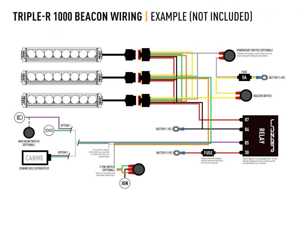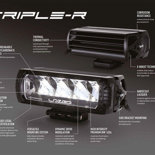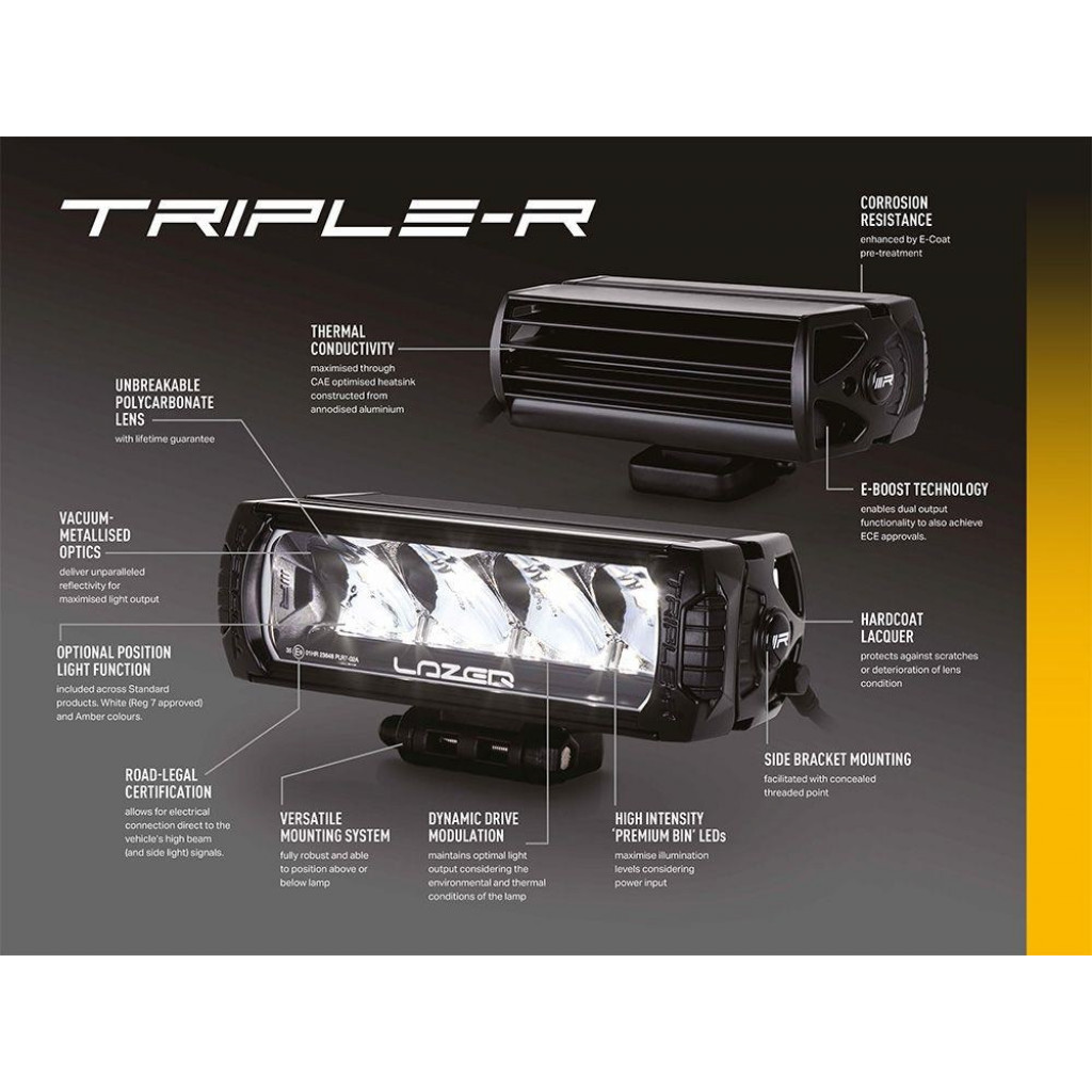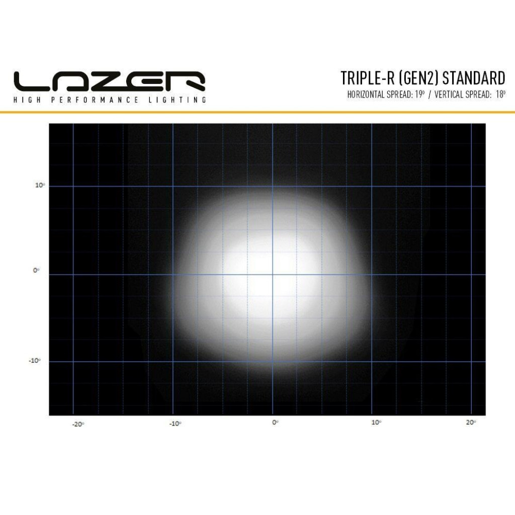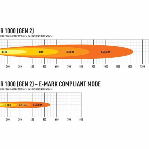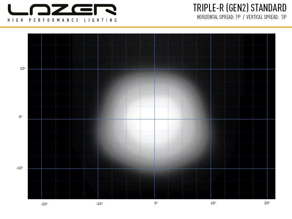 Lazer Triple-R 1000 G2 - BeaconDen ikoniske Triple-R 1000, en klar favorittfor tunge lastebiler og lette lastebiler, tilbys nå med integrert gul blinkende varselslys. Med 16 forskjelligeblitsmønstre, den ekstra sikkerhetsfunksjonen i lampen, kombineres med muligheten for å koble til en hvit eller gul posisjon/sidelysfunksjon, samt den eksepsjonelle fjernlysfunksjonen for kjørelys setter Triple-R 1000 et hakk over konkurrenteneHva er inkludert :- x1 Triple-R 1000 LED Lamp with Beacon Function- x2 Centre Mount (1114k)- x1 Installation InstructionsSpesifikasjoner :E-BoostE-Mark ModeVoltage Range (DC)10-32V10-32VLED Life50,000 hrs50,000 hrsWeight1.7 kg1.7 kgHIGH BEAM FUNCTIONTotal Luminous Flux9240Lm1848 LmTotal Driver #39FOV#39 Flux †5572 Lm1114 LmColour Temperature5000k5000kNumber of High Output LEDs88Power Consumption88 Watts17.6 WattsCurrent Draw (at 14.4V)6.1Amps1.2 AmpsStart-up Time *100ms100msCERTIFICATIONHigh BeamN/AECE R112E-Mark RefN/A12.5Position Light (White)ECE R7ECE R7Beacon (Amber)ECE R65ECE R65PHOTOMETRIC DATAHoriz Beam Angle19 Deg19 Deg0.25 lx Line1225metres548 metres0.5 lx Line866 metres387 metres1 lx Line612metres274 metres3 lx Line354metres158metres