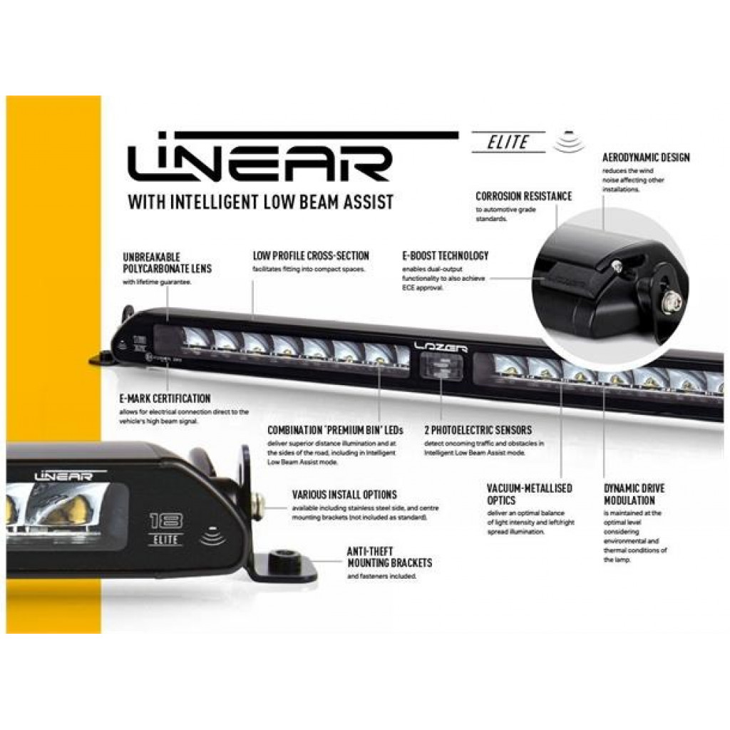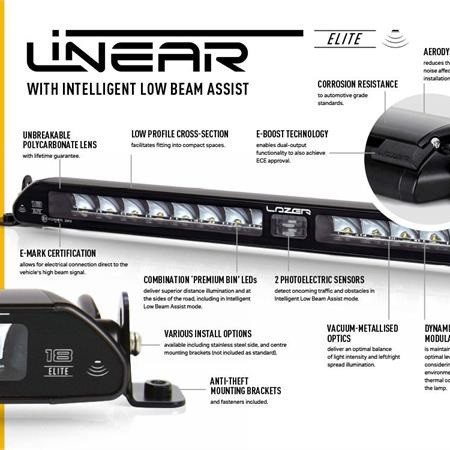Linear-18 Elite med intelligent nærlysassistent er en verdensnyhet, som bruker patentsøkt teknologi, og omdefinerer ytelsen og funksjonaliteten til LED ekstralys. En kombinasjon av de nyeste høyeffektive LED-ene gir et finjustert lysbilde, optimalisert for veibruk, som rett og slett er uovertruffen med tanke på lampens slanke form. I tillegg, gjennom bruk