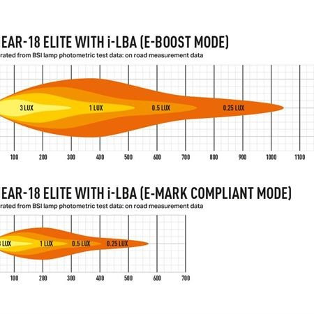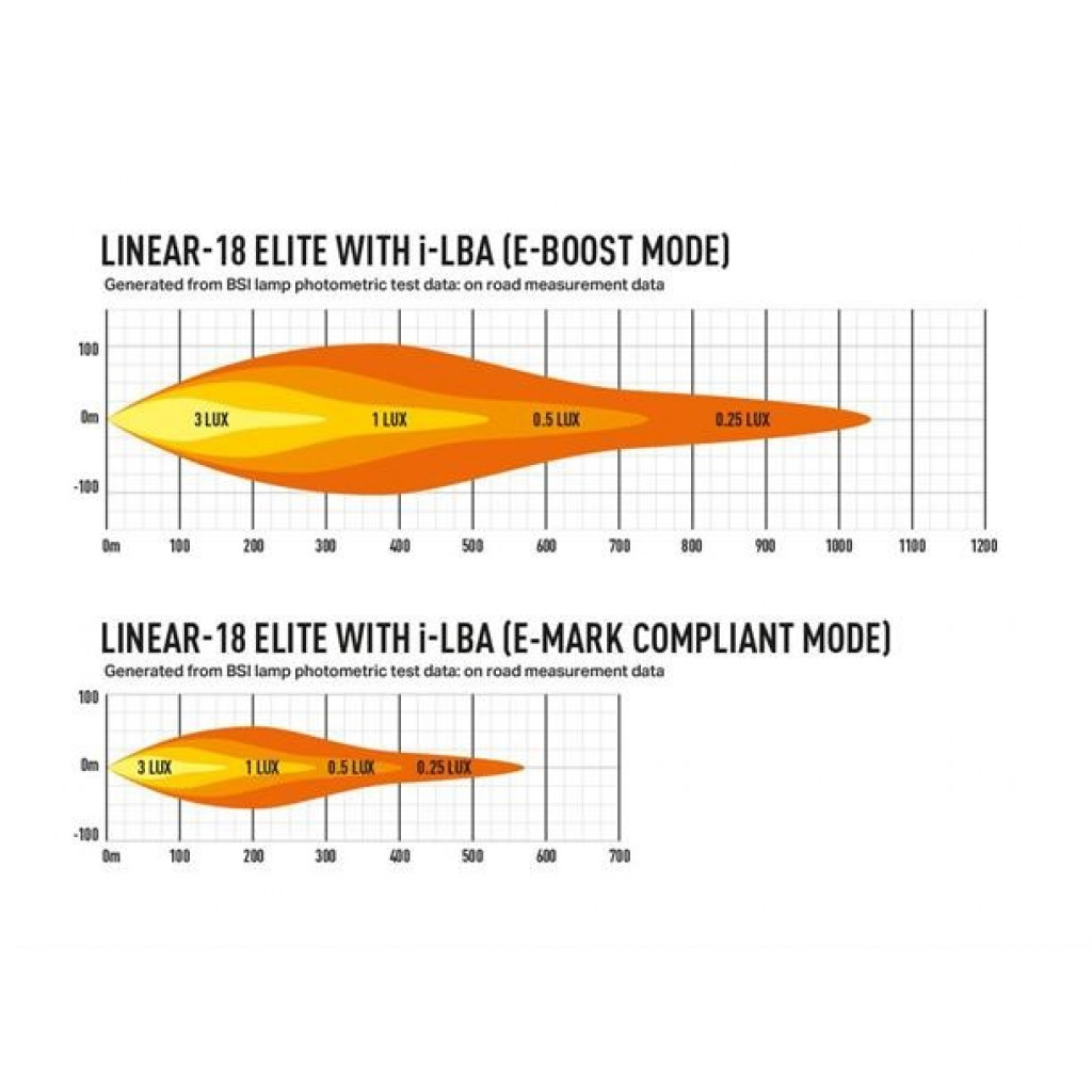 Linear-18 Elite med intelligent nærlysassistent er en verdensnyhet, som bruker patentsøkt teknologi, og omdefinerer ytelsen og funksjonaliteten til LED ekstralys. En kombinasjon av de nyeste høyeffektive LED-ene gir et finjustert lysbilde, optimalisert for veibruk, som rett og slett er uovertruffen med tanke på lampens slanke form. I tillegg, gjennom bruk av 2 fotoelektriske sensorer innebygd i lampen, når fjernlyset er slått av, er overgangen fra fjernlys kjørelys betydelig forbedret ettersom lampen opprettholder høyere belysningsnivåer i soner der det er bekreftet at det ikke er møtende kjøretøy eller hindringer.SPESIFIKASJONER:E-BoostE-Mark ModeVoltage Range (DC)10-32V10-32VLED Life50,000 hrs50,000 hrsWeight1,1 kg1,1kgHIGH BEAM FUNCTIONTotal Luminous Flux18000Lm5538LmTotal Driver #39FOV#39 Flux†12816Lm3943LmColour Temperature5000k5000kNumber of High Output LEDs4848Power Consumption135Watts43WattsCurrent Draw (@14.4V)10.4 Amps3.2AmpsStart-up Time *100ms100msCERTIFICATIONHigh BeamN/AECE R112E-Mark RefN/A17,5PHOTOMETRIC DATAHoriz Beam Angle64Deg64Deg0.25 lx Line1043m571m0.5 lx Line738m404m1 lx Line522m286m3 lx Line301m165m
