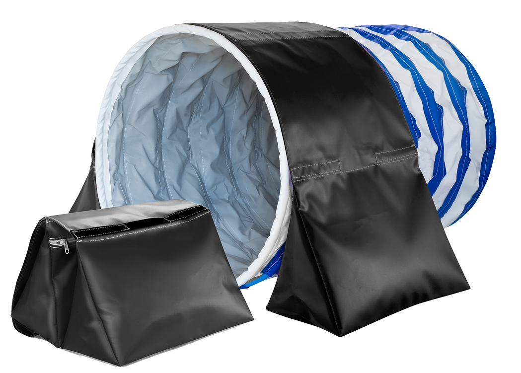 Hver lomme i JENNY-salbagen kan fylles med sand på opptil 10 kg. Dermed gir en samlet vekt på opptil 20 kg ikke bare stabilitet og sikring av tunnelens posisjon, men hindrer også at tunnelen sklir under sekkene.