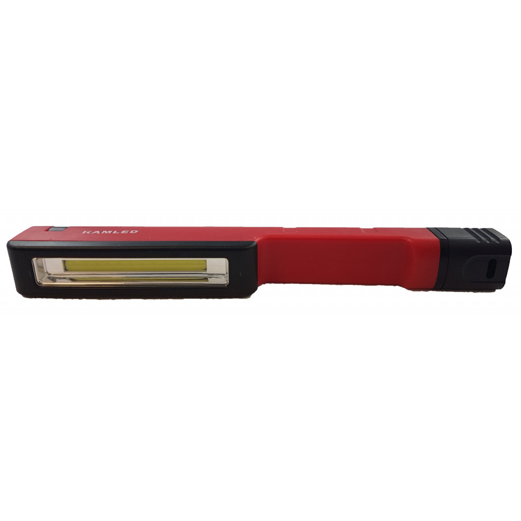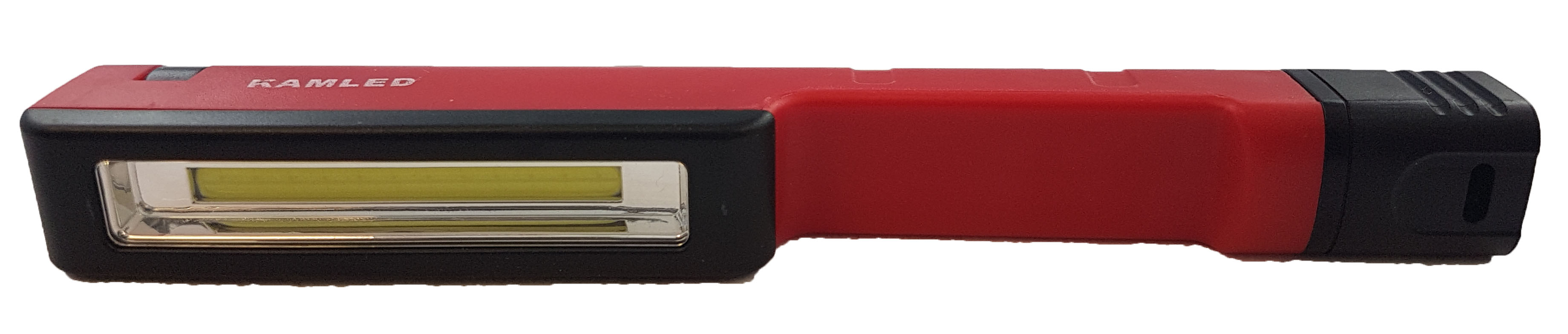 Liten LED lommelykt med COB LED på siden og 1 i front. Svingbart klips. Størrelse: 170x18x33mm Batteri: 3 stk. AAA ( Medfølger ikke ) Farge: Rød ABS