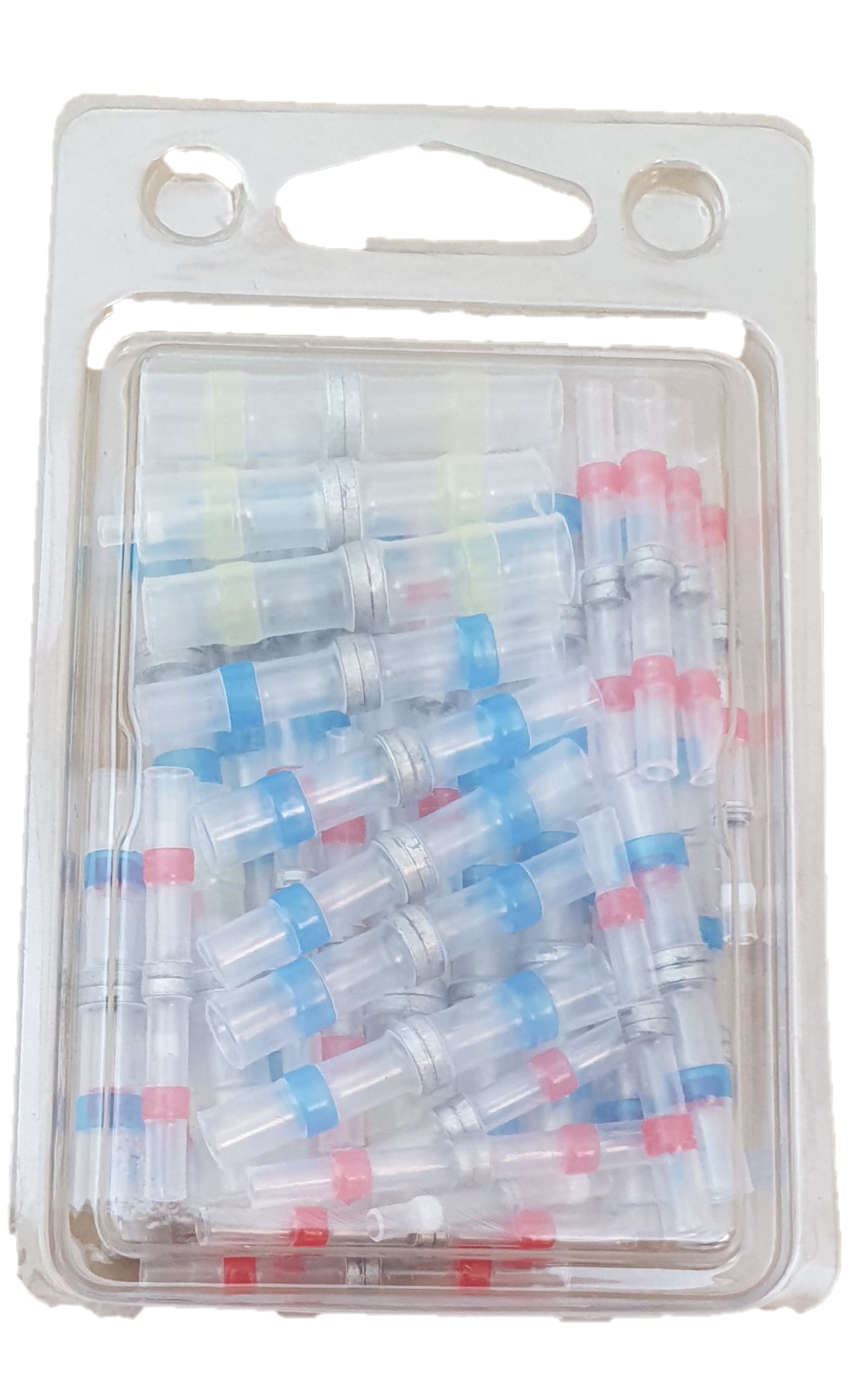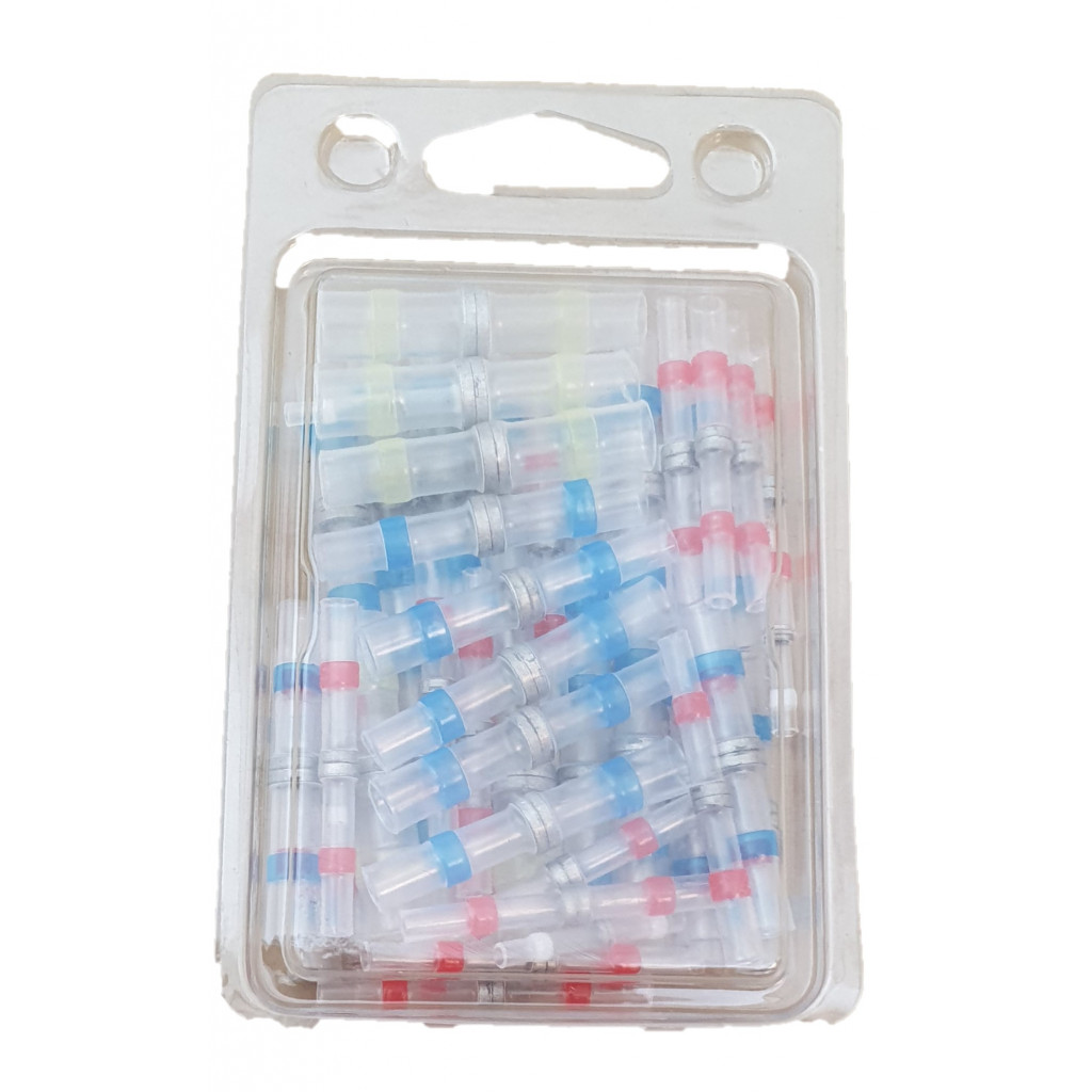 Blisterpakke med 40 stk. assorterte krympe-skjøtehylser med lim og 2 lodderinger. 5 stk. HVIT Skjøtehylse for 0,25-0,34mm² / A.W.G 26-24 20 stk. RØD Skjøtehylse for 0,5-1,0mm² / A.W.G 22-18 20 stk. BLÅ Skjøtehylse for 1,5-2,5mm² / A.W.G 26-24 5 stk. GUL Skjøtehylse for 4-6mm² / A.W.G 12-10