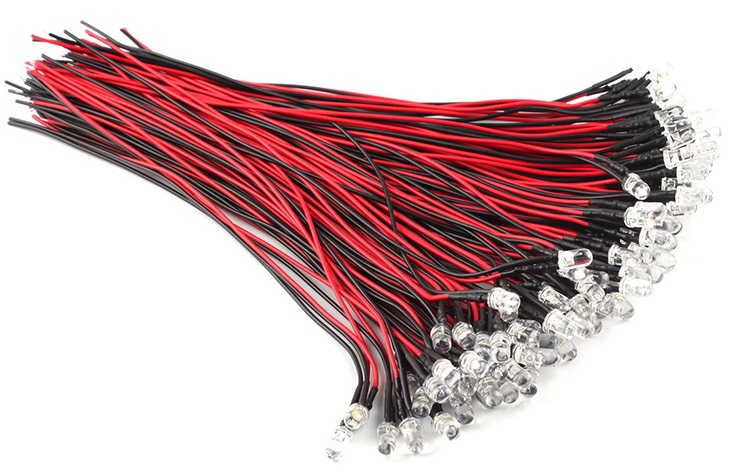 Hvit Lysdiode, 5mm, 24 volt, 20cm kabel 10 pakk