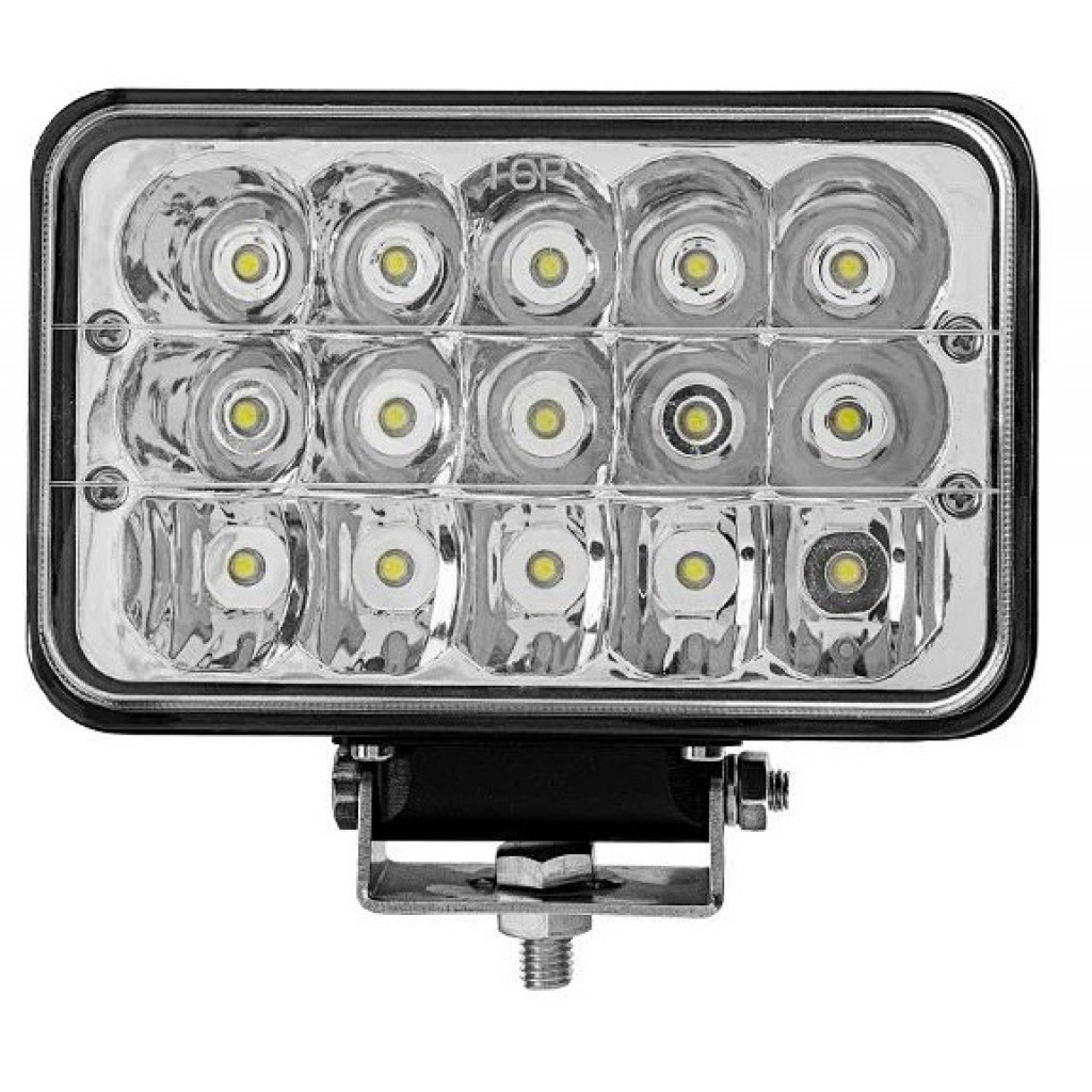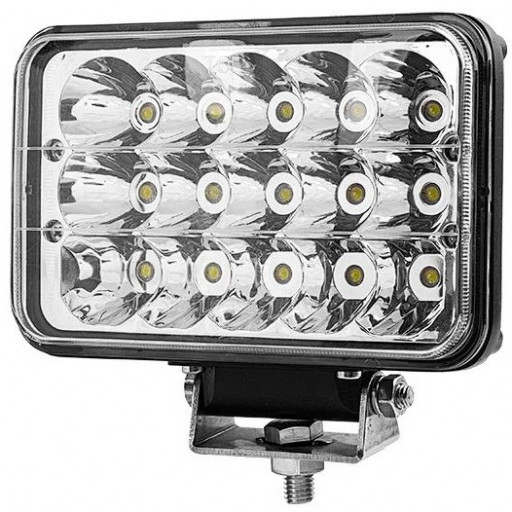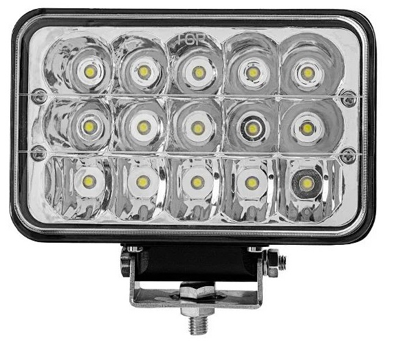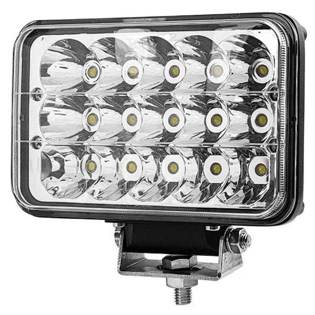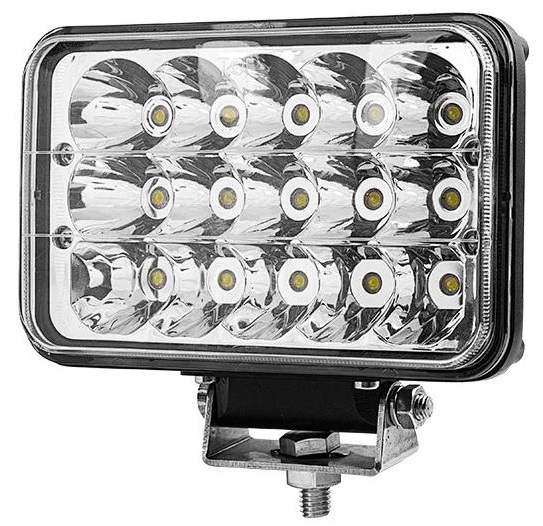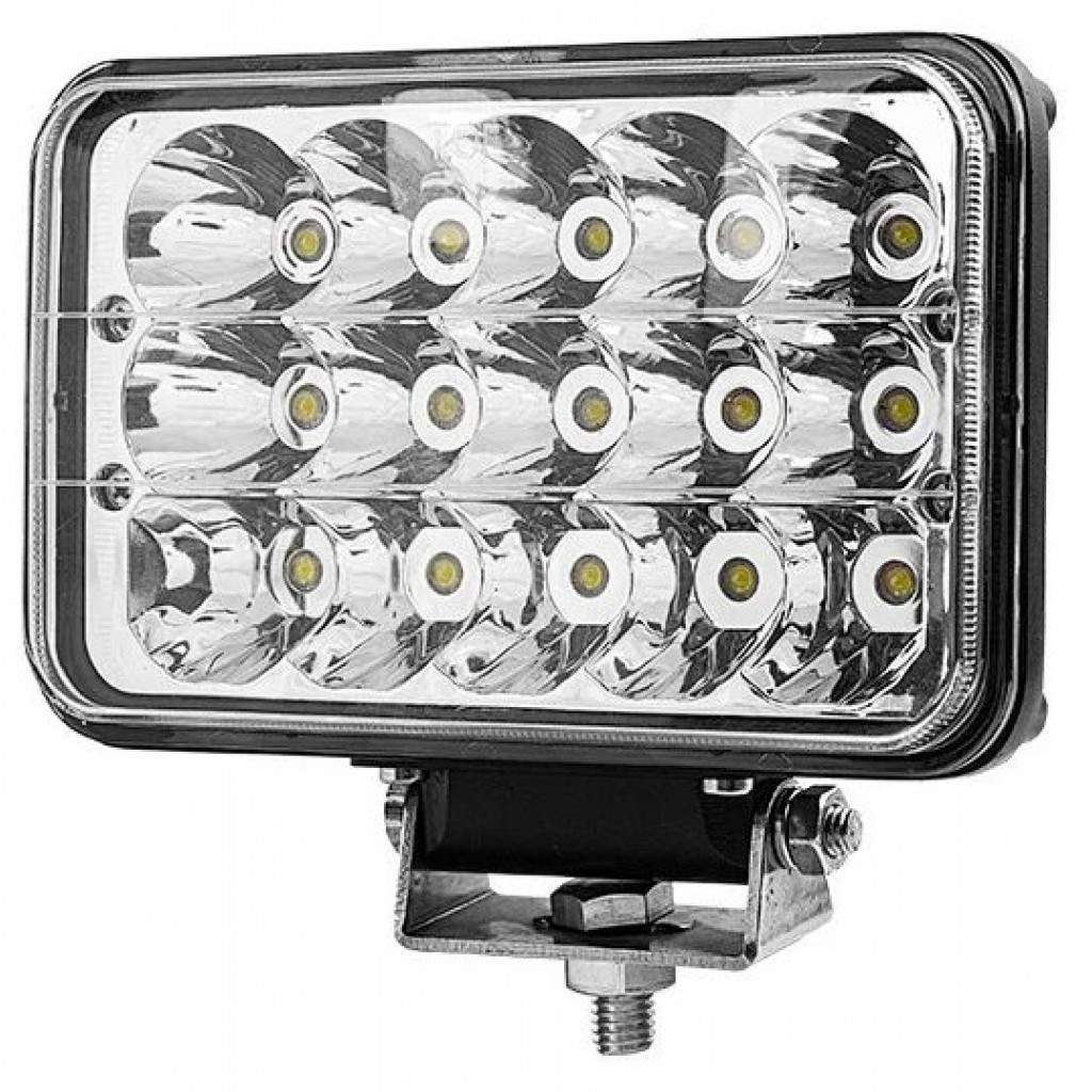 45 watt rektangulært hovedlys med høy og lav lysstyrke. Velg mellom 3600 eller 1700 lumen. . Bruksspenning: 9-32V DC . Vanntetningsgrad: IP 67 . Fargetemperatur: 600 Kelvin. . 15 stk. 3 Watt Bridgelux LED. Aluminium hus og PMMA linse . H4 tilkobling Størrelse: B=168mm x H=108mm x T=78mm Vekt: 1,0Kg Leveres nå med kraftig festebrakett.