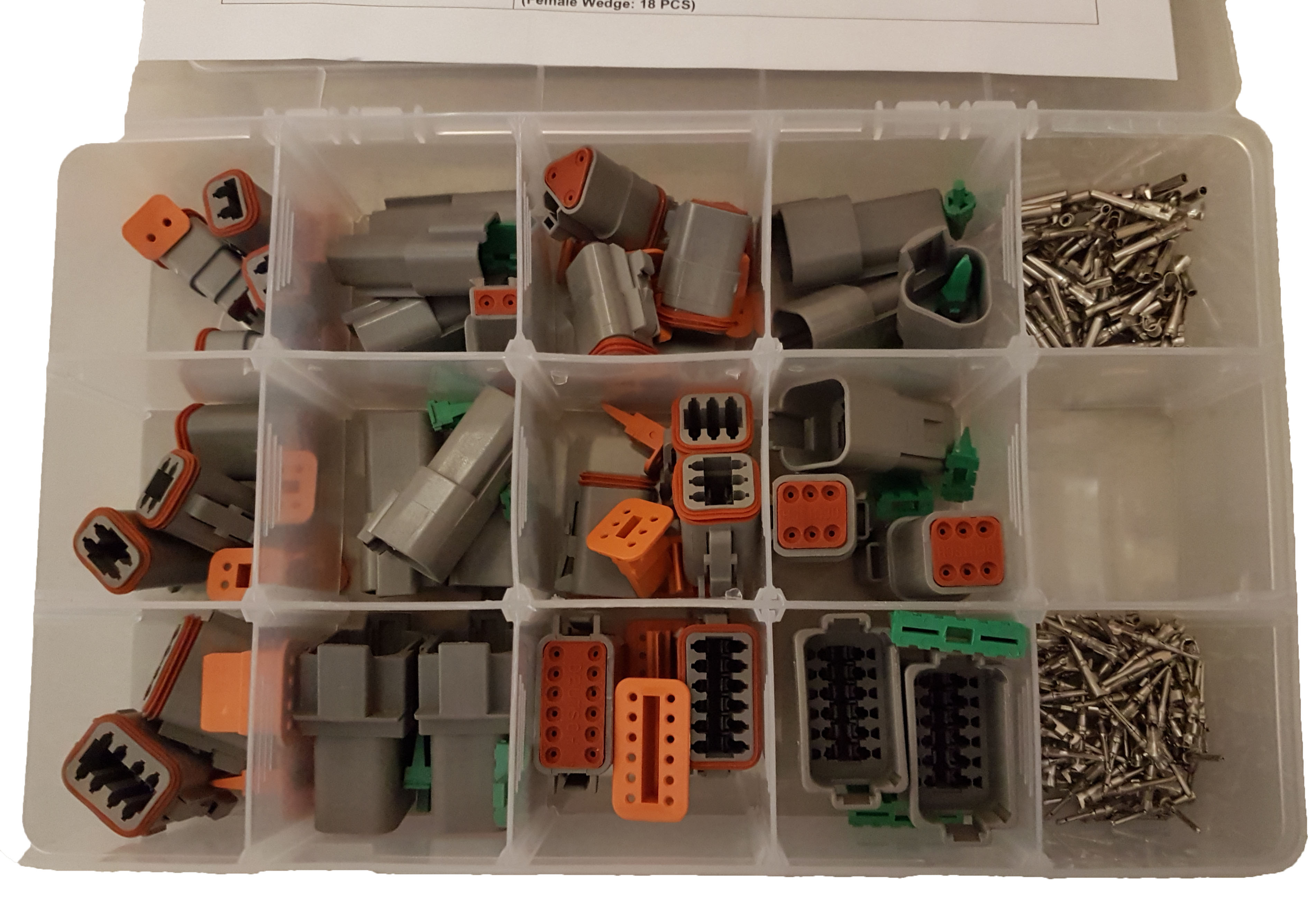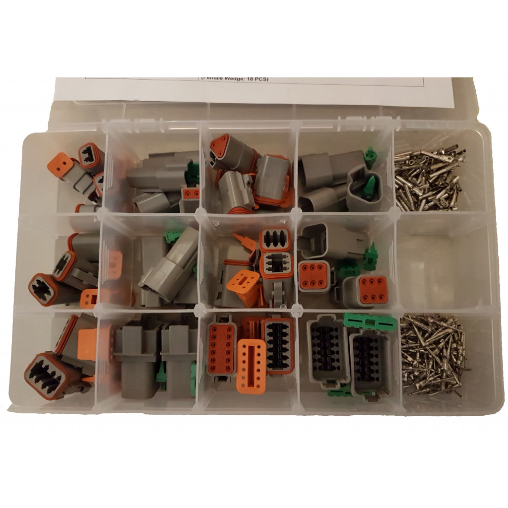 Plastboks med total 34 stk. DT koblinger Inneholder:2pin HAN 4 stk2pin HUN 4 stk3pin HAN 3 stk3pin HUN 3 stk4pin HAN 3 stk4pin HUN 3 stk6pin HAN 3 stk6pin HUN 3 stk8pin HAN 2 stk8pin HUN 2 stk12 pin HAN 2 stk12pin HUN 2 stk